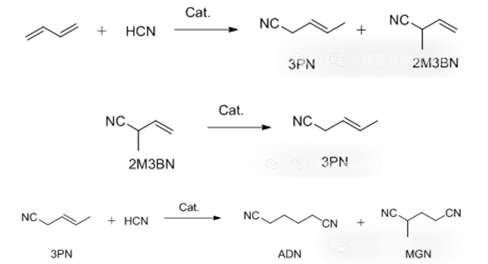 这套工艺的核心逻辑可分为三步:第一步,丁二烯与氢氰酸在高温、催化剂作用下生成3-戊烯腈和2-甲基-3-丁烯腈,未反应的丁二烯经减压回收后循环利用,两种产物通过精馏分离;第二步,将分离出的2-甲基-3-丁烯腈异构化为3-戊烯腈,最大化目标中间体产量;第三步,3-戊烯腈再次氰化生成己二腈,最终经精制得到合格产品。整个流程实现了原料的高效利用与产物的精准控制,尽显工艺先进性。