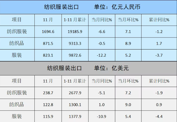 11月,纺织服装出口1694.6亿元,同比下降6.6%,环比增长7.1%,其中纺织品出口871.5亿元,下降0.5%,环比增长8.9%,服装出口823.1亿元,下降12.2%,环比增长5.2%。