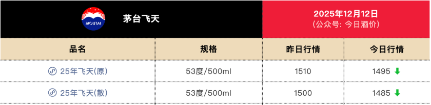 12月12日,第三方平台“今日酒价”数据显示,2025年53度500ml飞天茅台散瓶批发参考价已跌至1485元/瓶,原箱产品报价为1495元,均较前一日下跌15元,创历史新低。这一价格也是首次跌破1499元的官方指导价,较两款产品上线时的2220元、2255元累计跌幅均已超过30%。
