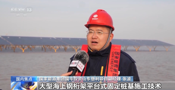 国家能源集团国华投资山东垦利项目副经理 张波:项目在全国创新应用大型海上钢桁架平台式固定桩基施工技术,采用“四桩基础+光伏平台”优化结构,平台倾角为精准调校的15度,不仅能抵抗11级强风和冬季冰情,还能节约项目用钢量超10%,为同类项目开发建设提供经验借鉴。