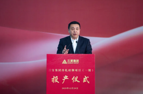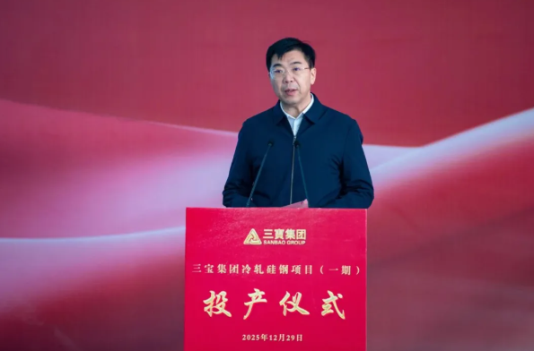 2025年12月29日上午,三宝集团冷轧硅钢项目(一期)投产仪式顺利举行。随着启动指令下达,三宝集团董事长王光文与中国二十冶集团党委书记、董事长徐立,中冶南方党委副书记、总经理黄能超等共同按下启动按钮,10米外的硅钢生产线随即平稳运转,钢卷成功下线,标志着该项目正式投产,为中国钢铁产业向高端化、智能化转型注入新动能。