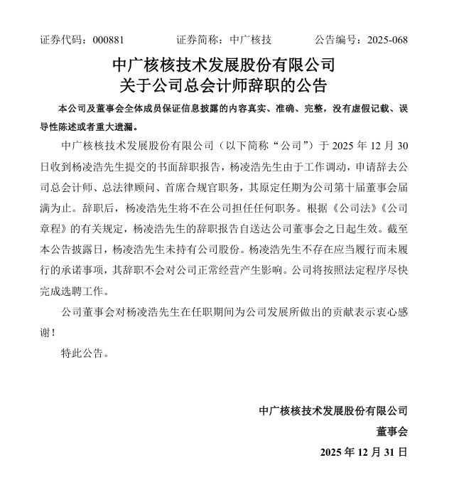 中广核技发布公告称,公司于2025年12月30日收到杨凌浩先生提交的书面辞职报告,杨凌浩先生由于工作调动,申请辞去公司总会计师、总法律顾问、首席合规官职务,其原定任期为公司第十届董事会届满为止。辞职后,杨凌浩先生将不在公司担任任何职务。
