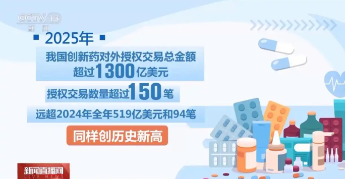 从国家药监局还获悉,2025年中国创新药对外授权交易总金额超过1300亿美元,授权交易数量超过150笔,远超2024年全年519亿美元和94笔,同样创历史新高。中国在研新药管线约占全球30%,位列全球第二。