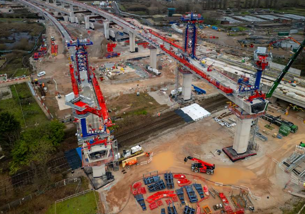 三角洲枢纽作为伯明翰东部的大型交通枢纽,将连接往返伯明翰的HS2高速铁路与南北主干高速铁路。该枢纽的桥梁工程由一系列高架桥组成,新铁路需跨越公路、铁路、河流及洪泛区。为完成这一挑战,主要工程承包商BBV利用圣诞节期间为期五天的铁路封闭施工窗口,在现有铁路线上架设了两座平行桥梁,完成了重要的桥梁工程作业。施工期间,伯明翰新街站和科尔斯希尔站之间的客运服务临时由巴士替代。