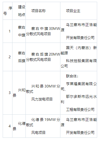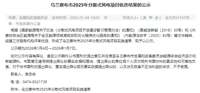 维度网讯,1月4日,内蒙古乌兰察布发改委公示《乌兰察布2025年分散式风电项目优选结果》。