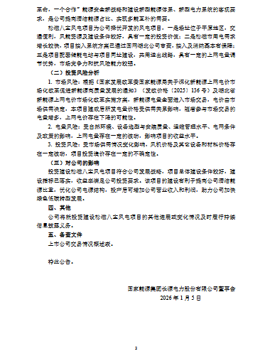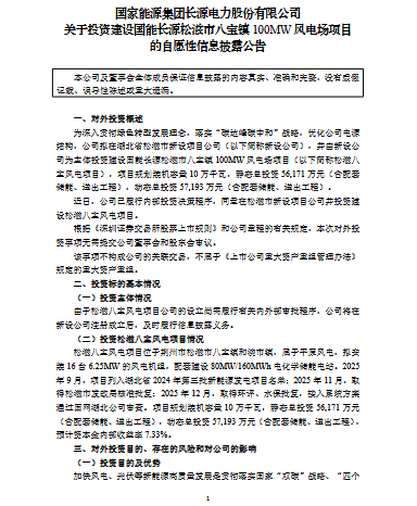 维度网讯,1月5日,中国长源电力发布《关于投资建设国能长源松滋市八宝镇100MW风电场项目的自愿性信息披露公告》。