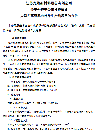 维度网讯,近日,中国九鼎新材发布《关于全资子公司投资建设大型兆瓦级风电叶片生产线项目的公告》。