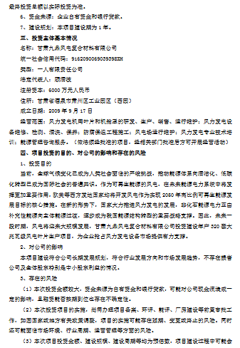 风力发电叶片项目位于甘肃酒泉经济技术开发区,拟建设规模为年产10-12MW风电叶片320套,资金来源为企业自有资金和银行贷款。