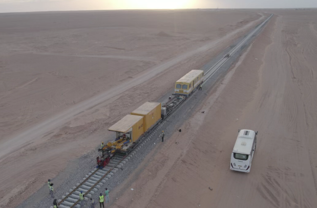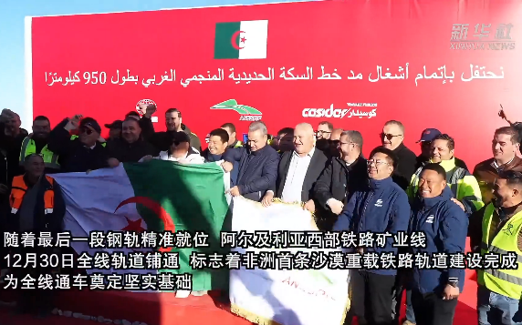 随着最后一段钢轨精准就位,中国铁建阿尔及利亚西部铁路矿业线12月30日全线轨道铺通,标志着非洲首条沙漠重载铁路轨道建设完成,为全线通车奠定坚实基础。