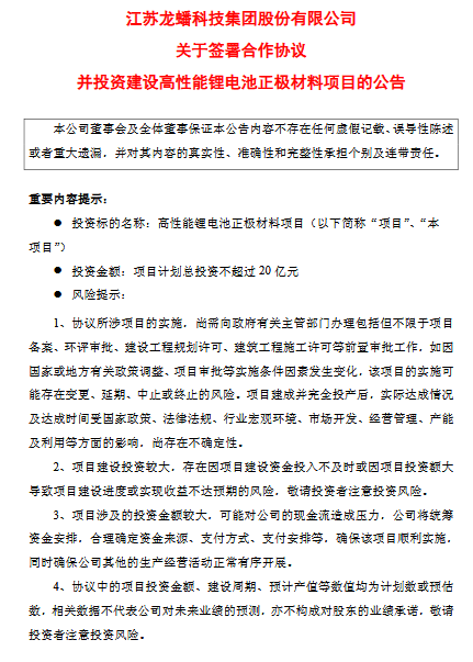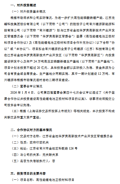 维度网讯,1月5日,中国龙蟠科技发布《关于签署合作协议并投资建设高性能锂电池正极材料项目的公告》。