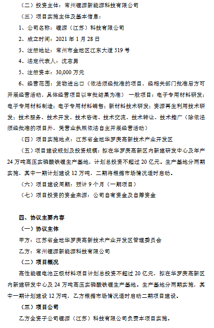 项目计划总投资不超过20亿元,生产基地分两期实施,其中一期计划建设 12 万吨,常州锂源将根据市场情况适时启动二期项目建设。