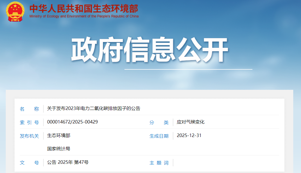 维度网讯,2025年12月31日,生态环境部发布2023年电力二氧化碳排放因子的公告。