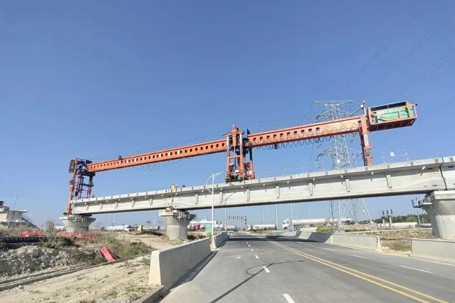 架梁期间,项目周密制定专项施工方案,通过加强技术培训、做实安全交底、严格过程管控等举措,筑牢安全作业屏障。现场采用自动化程度高、机动灵活、安全可靠的TJ180架桥机与98吨龙门吊协同施工,为架设任务高效推进提供了有力保障。