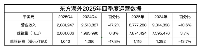 具体而言,2025年第四季度,东方海外实现营业收入20.8亿美元,同比减少17.2%;总载货量同比上升0.8%,运力上升4.5%。整体运载率较2024年同期下降3.1%,单箱平均运费1040美元,同比下降17.8%。