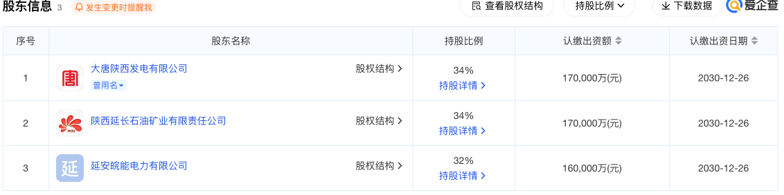 新公司由中国大唐集团二级全资子公司大唐陕西发电有限公司、陕西延长石油(集团)有限责任公司二级全资子公司陕西延长石油矿业有限责任公司,以及安徽省能源集团控股子公司延安皖能电力有限公司三家共同出资,前二者分别出资17亿元,持股34%;后者出资16亿元,持股32%。