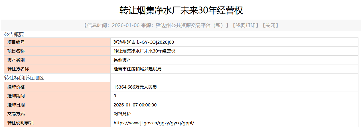 维度网讯,2026年1月6日,吉林省延吉市住建局挂牌转让两净水厂未来30年经营权,合计挂牌价格4.98亿元。情况如下: