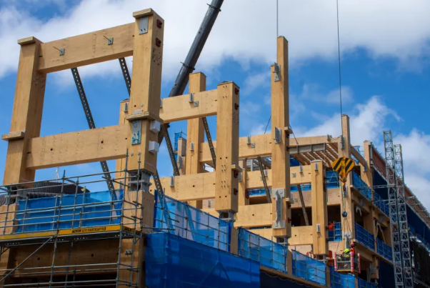 新建筑的木结构主要由巨大的实木框架构成,这种创新设计不仅减少了气候污染,还带来了施工速度的提升。承包商LT McGuinness的施工总监克林·曼努埃尔介绍,他们建造的木结构H型框架底部装有铰链,可以水平放置后用起重机垂直吊装,比建造混凝土结构快得多。此外,新建筑还采用了分阶段施工方式,减少了木材暴露在自然环境中的时间,并严格规定了公差要求,确保木结构安装精度。