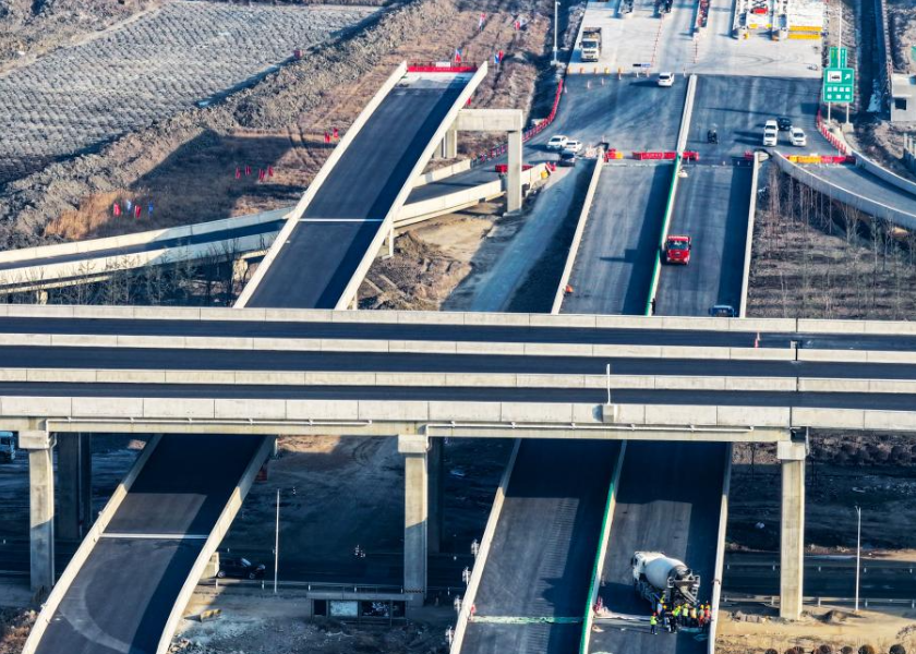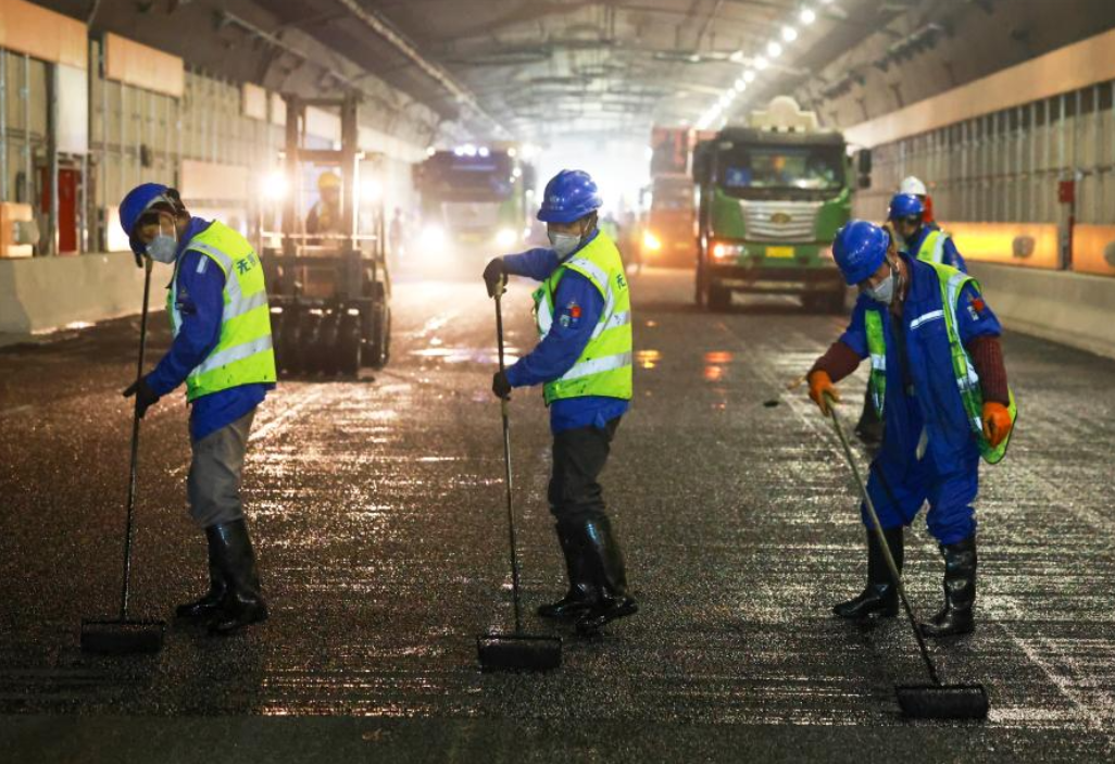 进入2025年12月下旬,隧道路面铺装施工全面启动,这一环节对于隧道工程整体质量与后续使用至关重要。隧道内路面铺装总面积超过16万平方米,设计铺装厚度为5厘米,采用高韧冷拌树脂混凝土铺装材料。该材料可在常温条件下拌和与摊铺,实现全程零烟尘、零有害气体排放,致力于打造“高耐久、低排放、智能化”的隧道工程铺装示范项目。项目团队自主建设两套树脂混凝土拌和楼,研发胶结料智能控制平台及监控系统,确保混合料质量稳定,从技术层面保障了隧道工程路面铺装的高质量完成。同时,为解决低流动性混合料易滞留的难题,对摊铺机和压路机设备进行改造升级,有效提升了铺装均匀性和效率,进一步提升了隧道工程路面铺装水平。