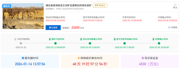 1月16日,中国湖北省公共资源产权交易平台发布南漳县龙王沟矿区建筑石料用灰岩矿采矿权网上挂牌出让公告。该矿资源储量超2.4亿吨,拟出让年限30年,起始价约2.27亿元。折合资源价款0.94元/吨。