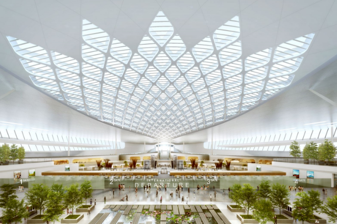 建筑设计以越南国花莲花为核心意象,由韩国Heerim Architects & Planners事务所完成。航站楼造型柔美流畅,屋顶线条模拟莲花花瓣形态,将传统文化符号与现代航空功能深度融合,象征着越南的优雅、力量和温暖的文化。