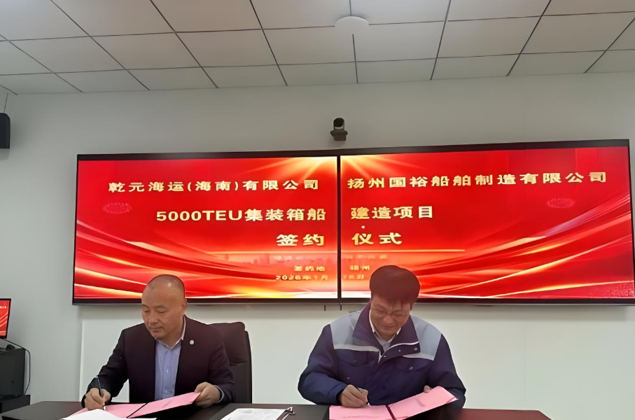 1月16日上午,扬州国裕船舶制造有限公司与乾元海运(海南)有限公司举行5000TEU集装箱船建造项目签约仪式。双方代表共同落笔,敲定项目合作细节,标志着这一重点运力提升项目正式落地,开启合作共赢的全新征程。