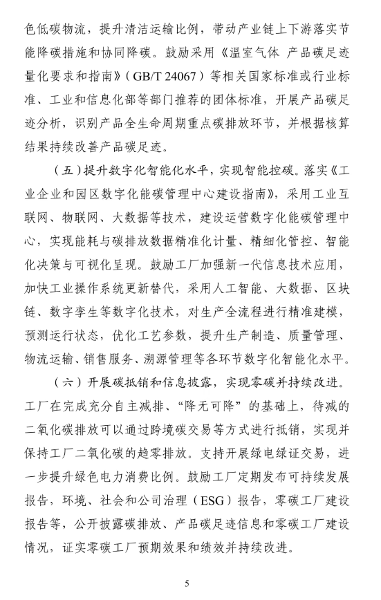 各省、自治区、直辖市及计划单列市、新疆生产建设兵团工业和信息化主管部门、发展改革委、生态环境主管部门、国资委、能源主管部门,有关中央企业: 为坚持以习近平新时代中国特色社会主义思想为指导,深入贯彻习近平生态文明思想,全面贯彻党的二十大和二十届历次全会精神,落实国务院办公厅《制造业绿色低碳发展行动方案(2025—2027年)》,深挖工业和信息化领域节能降碳潜力,带动重点行业领域减碳增效和绿色低碳转型,培育发展新质生产力,工业和信息化部、国家发展改革委、生态环境部、国务院国资委、国家能源局共同研究制定了《关于开展零碳工厂建设工作的指导意见》。现印发给你们,请结合实际,认真贯彻落实。