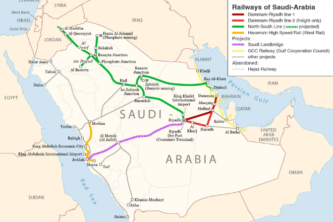 沙特北部铁路全长2750公里,包括连接西北部矿区与波斯湾港口的1550公里货运线,以及连接首都利雅得与约旦边境的1250公里客运线,是沙特境内重要的跨区域铁路通道。多家中企参与建设,包括中国土木、中铁十五局、中铁十八局等。SAR规划进一步拓展北部铁路客运服务,包括增设阿尔祖尔菲等新客运列车车站。