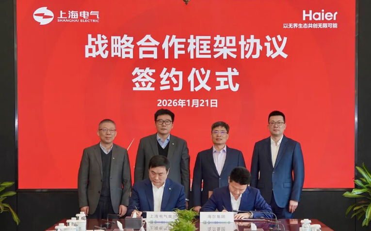 1月21日,上海电气集团与海尔集团在上海签署战略合作协议。上海电气集团党委书记、董事长吴磊与海尔集团党委书记、董事局主席、首席执行官周云杰共同出席并见证了签约仪式。上海电气集团党委副书记、总裁朱兆开,海尔集团副总裁赵弇锋等一同出席活动。