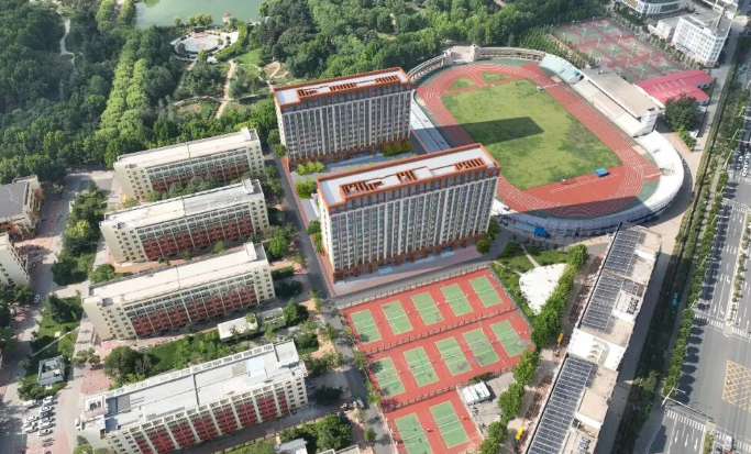 两栋公寓呈“一”字形,遵循校园“黄+白+红”的建筑色彩,主墙面以米黄色为主,红白色窗格相间,矩形窗户排列整齐,与园林式的校园景观相得益彰。宿舍楼内规划直饮水、洗衣房等生活配套设施,宿舍设有睡眠区、学习区和储物区,营造简洁、清新的氛围。宿舍采光向布置晾晒区和干湿分离卫生间。学校在两栋楼间打造休闲空间、交流空间、林下空间等多层次景观空间,通过现代设计语言展现农业智慧,兼顾功能与生态,实用性与文化性的统一。