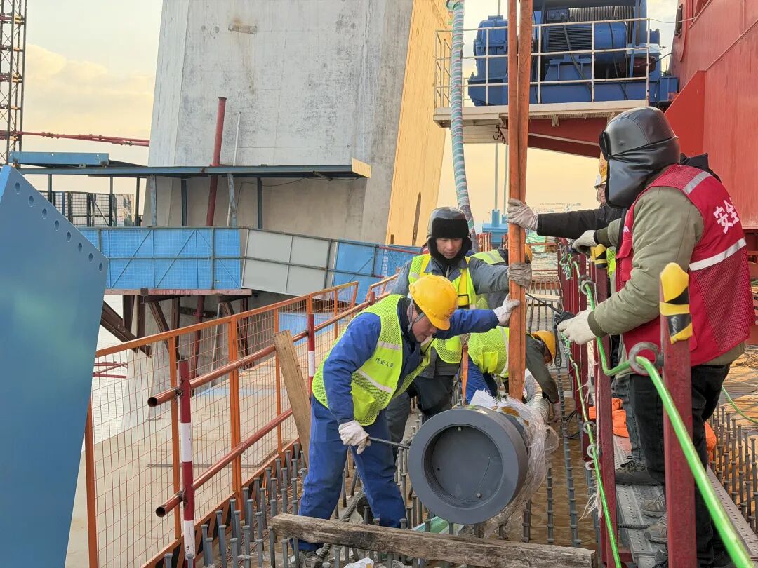 这座大型铁路桥梁共需安装112根斜拉索。本次施工的3号塔及后续的4号塔将各自安装14组斜拉索,每组由4根构成。单根斜拉索最大长度为203米,成盘重量超过36吨。斜拉索采用直径为7毫米的平行钢丝,设计为双索面扇形布置,钢丝标准抗拉强度为2100兆帕,表面采用锌铝合金镀层进行防护。目前,大桥公路层南侧边跨混凝土桥面板已铺装完成,中跨侧的悬臂钢梁吊装作业计划于本月23日展开。