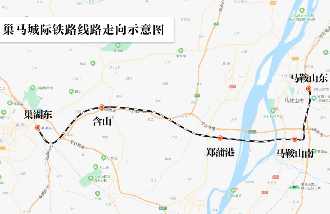 其北接商合杭高铁,东联宁安高铁,是马鞍山与安徽省会合肥的直接联通线,正线全长60.757公里,联络线全长11.667公里(单线),设计时速350公里,全线新建车站3座,分别为含山站、郑蒲港站、马鞍山南站。