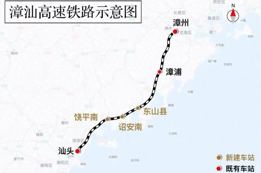 新建漳州至汕头高速铁路位于中国东南沿海,北起福建省漳州市漳州站,终至广东省汕头市汕头站,设计时速350公里。漳汕高铁全线建成通车后,将与福厦高铁、广汕高铁等共同组成沿海大通道,进一步完善区域路网结构,助力中国东部沿海地区高质量发展。