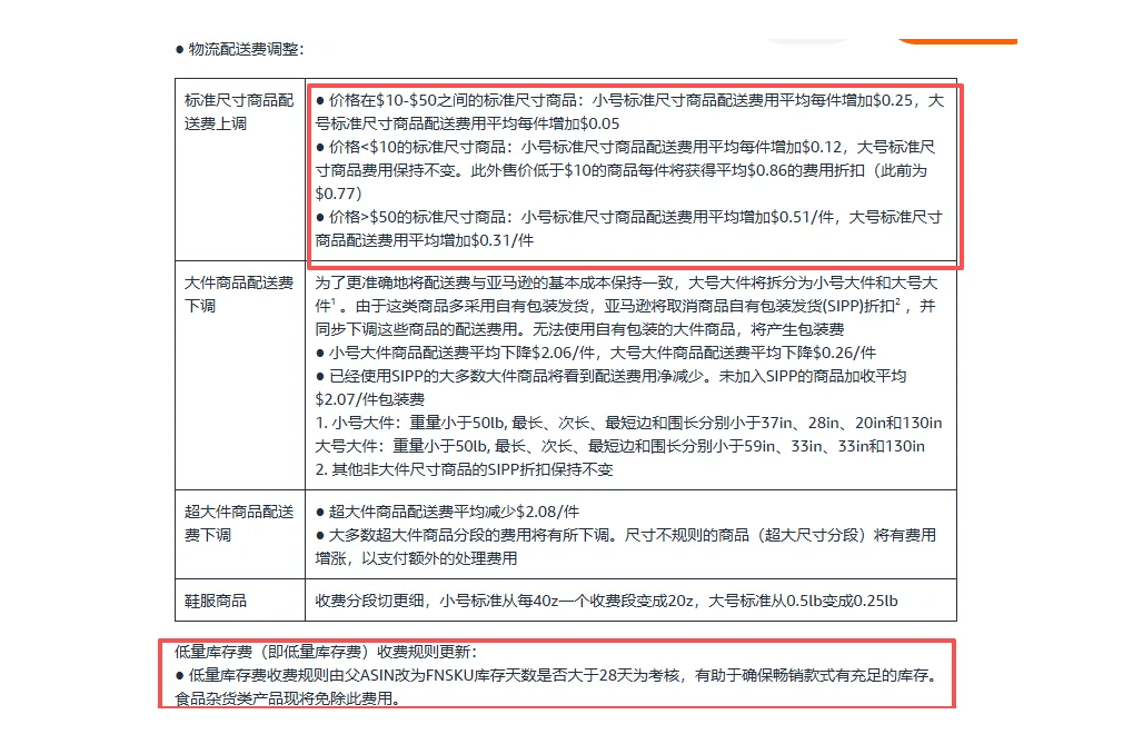 高价(高于50美元)小号涨0.51美元每件、大号涨0.31美元每件;低库存费用改按FNSKU核算,食品类商品豁免。