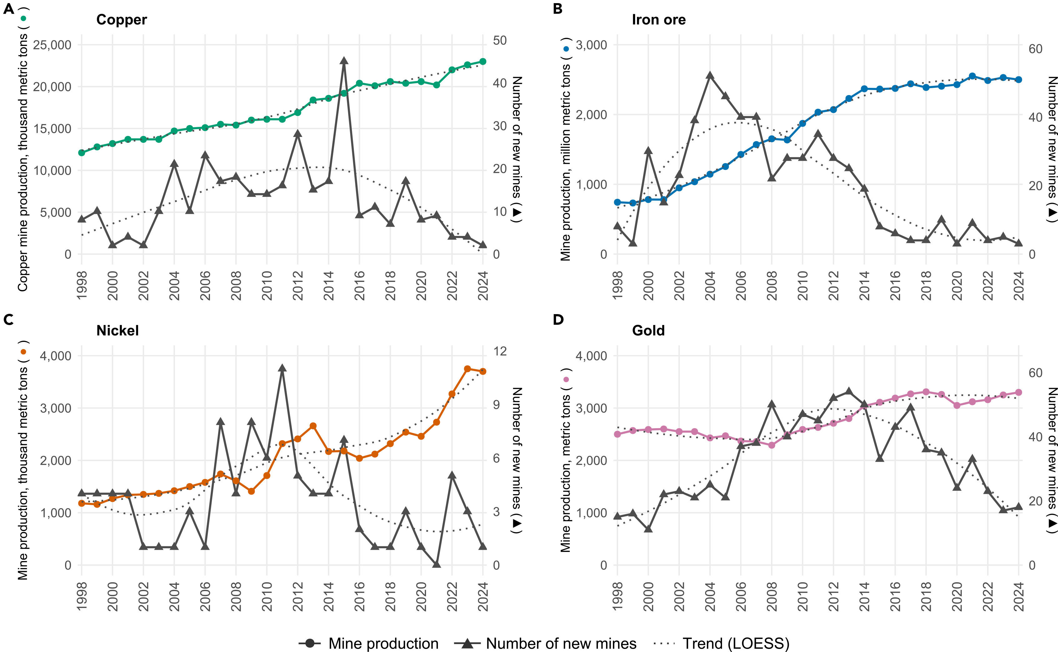 一项最新研究显示,全球矿业正日益转变为依赖现有矿区扩建的“棕地产业”,新矿山开发显著放缓。这项由澳大利亚昆士兰大学可持续矿产研究所进行并于2026年1月发布的研究,系统分析了1998年至2024年的全球数据,明确指出为满足能源转型等需求,行业重心已从开发新矿转向对既有项目的深度挖掘与扩张。