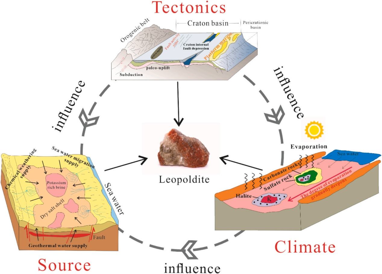 研究进一步强调,钾盐成矿是“构造–气候–物源”三大要素在特定时空背景下协同耦合的结果。其中构造活动为成矿提供空间和物质迁移通道,气候干旱程度控制卤水的蒸发浓缩强度,物质来源直接影响钾盐矿床的规模与矿物组合。因此,全球不同地域、不同地质时期的钾盐矿床通常表现出显著的成矿模式差异,这种成因机制的异质性意味着单一的成矿模型难以普适性解释全球钾盐矿床的形成,使得全球钾盐勘探面临巨大挑战。同时这种异质性进一步加剧了全球钾盐资源分布的高度不均衡性,给粮食安全需求迫切的国家实现钾盐可持续供给带来严峻挑战。