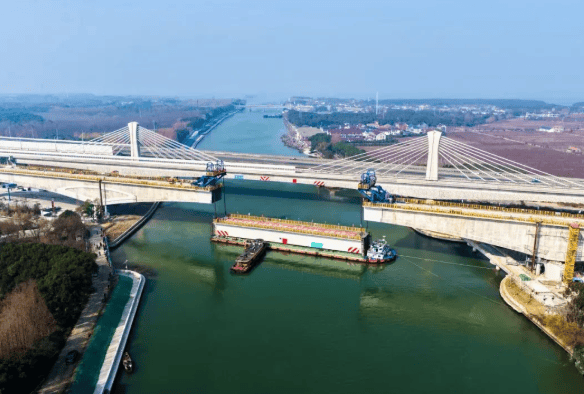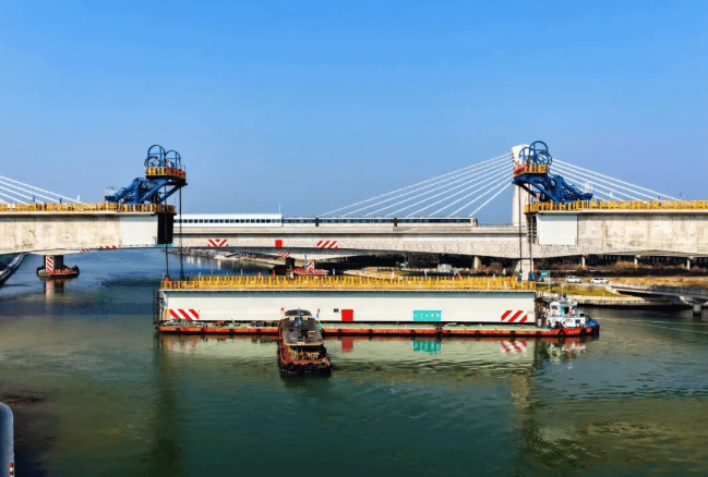作为项目全线控制性工程之一,该桥梁工程的主跨设计为200米,是目前国内市域铁路中最大跨度的无砟轨道连续混合梁桥。桥梁主体采用钢混结合结构,其中主跨中部为68米钢箱梁。