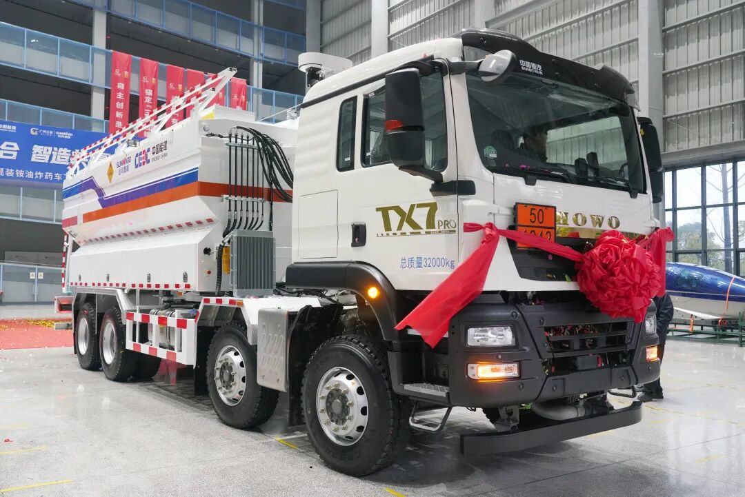 本次下线的数智化现场混装铵油炸药车,是将大数据、物联网等新兴技术与传统现场混装炸药车相结合形成的新型现场混装铵油炸药车,创新融合精准控制、精确计量和物联网技术,具备数字化管控、一键装药、精准混配能力,填补了中国现场混装铵油炸药车爆破施工智能化装药的技术空白。