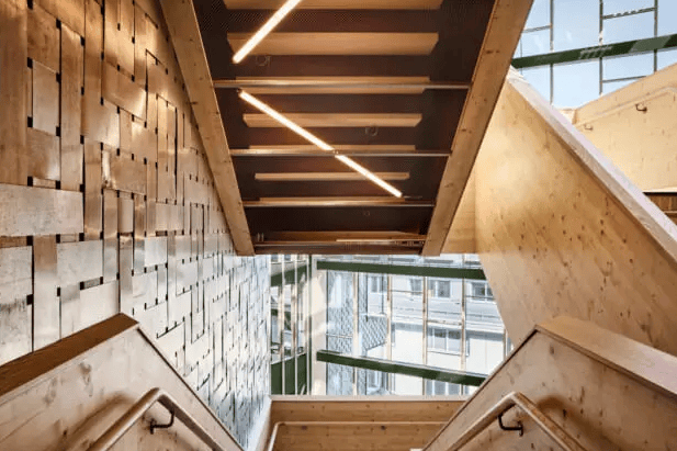 改造过程中,设计团队保留了原建筑约80%的混凝土结构和地基,大幅减少了新建工程常见的碳排放。与同等规模的木结构建筑相比,该项目的碳足迹降低了近一半。循环设计理念贯穿始终:70%的旧门得以保留,约70%的原屋顶铝板被重新制作为装饰元素,另有105吨石膏板被拆卸并重组利用。建筑外立面采用了气候影响较小的天然石板,结合集成太阳能电池板和增强的隔热层,提升了能源效率与自然采光。
