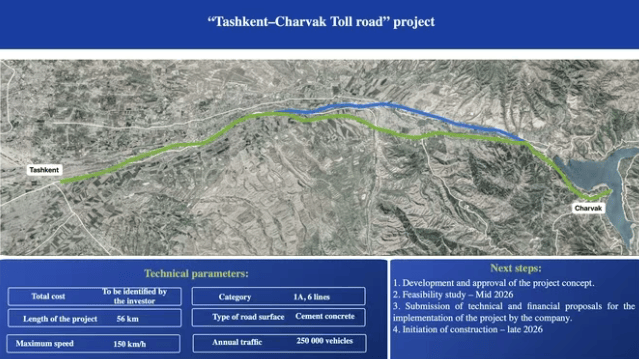 此外,塔什干-查尔瓦克(Chorvoq)还将修建一条全长56公里的收费公路。项目可行性研究预计将在2026年年中完成,建设工作将于当年年底启动,年交通流量预计为25万辆。