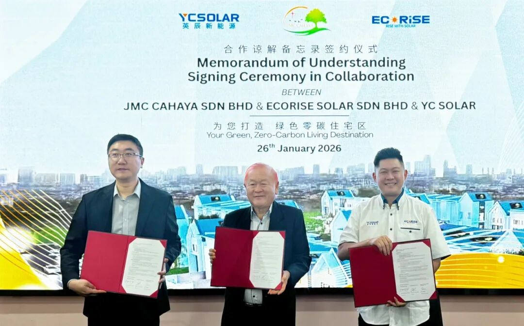 1月26日,英辰(雄安)能源科技有限公司、马来西亚本土房企JMC Cahaya Sdn Bhd与太阳能解决方案提供商EcoRise Solar Sdn Bhd在马来西亚签署合作备忘录。三方将整合各自资源优势与技术能力,以Cumulus3高档住宅项目为载体,共同建设马来西亚首个标杆性零碳社区,为当地可持续生活方式与绿色能源应用提供示范。