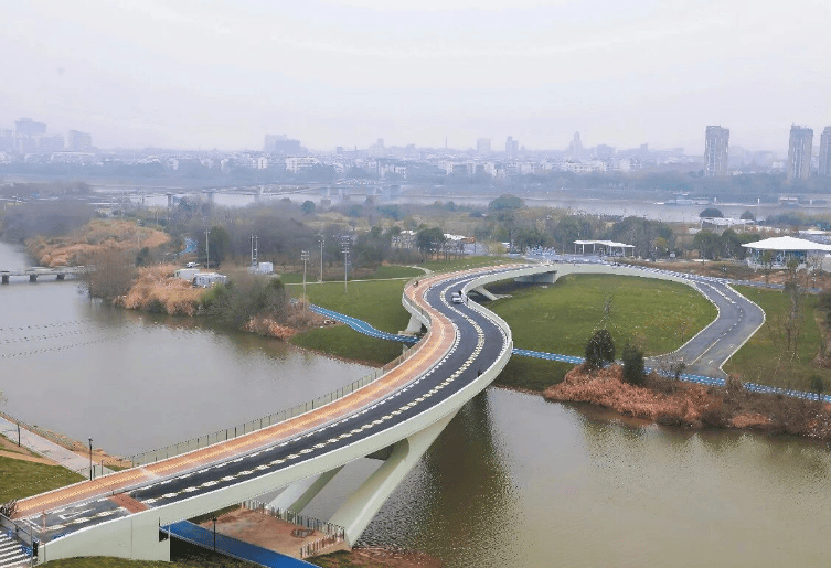 主桥全长约220米,连接鹿鸣半岛银泰周边与江堤道路,以往需绕行的路线如今一桥直达。桥头设有环岛园路,行人、自行车与观光车皆可舒适通行。漫步桥上,江风拂面、风景如画,便捷与意趣兼得。