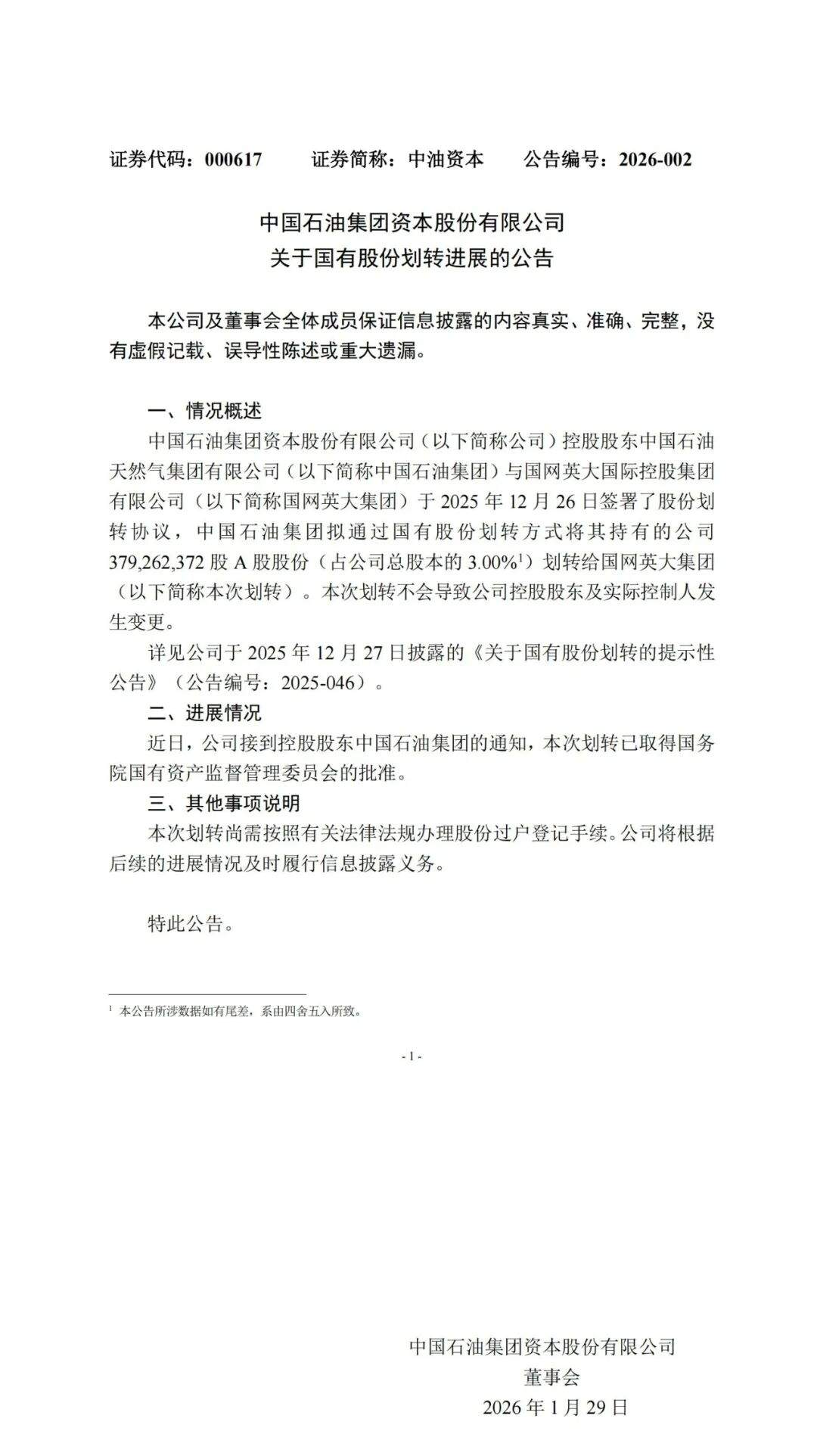 《关于国有股份划转进展的公告》显示,中油资本有限控股股东中国石油集团与国网英大集团于2025年12月26日签署了股份划转协议,中国石油集团拟通过国有股份划转方式将其持有的公司379,262,372 股A股股份(占公司总股本的3.00%)划转给国网英大集团。近日,中油资本有限接到控股股东中国石油集团的通知,本次划转已取得国务院国有资产监督管理委员会的批准。