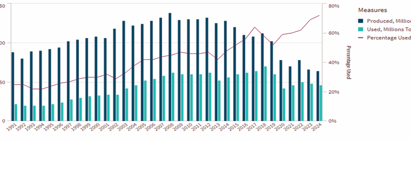 整体来看,2024年美国煤灰渣回收率达到72%,高于2023年的69%,这标志着该国此类材料有益利用率连续十年超过50%。根据协会数据,2024年新产煤燃烧产品的有益利用量为4600万吨,与上年基本持平。新产量从2023年的6670万吨下降至6360万吨,部分反映了能源结构向天然气和可再生能源的转变。