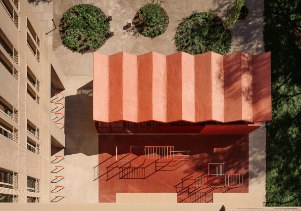 在室内设计方面,公寓采用了简约而温馨的风格。锈橙色的家具、栏杆及建筑细部为现代空间增添了暖意与时尚感。天然材料的运用与精选的家具进一步营造出安全舒适的氛围,而现代工业风格的厨房则鼓励学生进行烹饪、聚餐等社交活动。