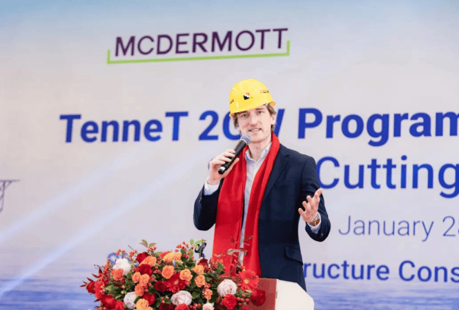 仪式现场,麦克德莫特高级项目经理Alexander Snijders作为TenneT代表登台致开幕辞。他表示,很高兴上海建工钢构已成为麦克德莫特供应链中实力强劲、值得信赖的合作伙伴,凭借出色的技术与质量、高效的响应能力和强烈的责任担当,赢得了认可。麦克德莫特对双方的合作充满信心,也期待进一步深化合作关系。