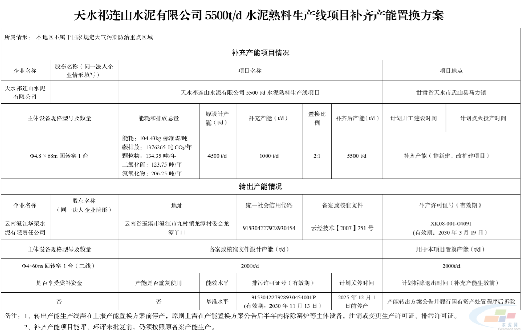 同时,天水祁连山水泥有限公司的4500吨/日熟料生产线也将补充1000吨/日的产能,置换比例同样为2:1。指标来源于云南澄江华荣水泥有限责任公司二线的2000吨/日熟料生产线。通过产能置换,企业能够优化生产线布局,增强市场竞争力。