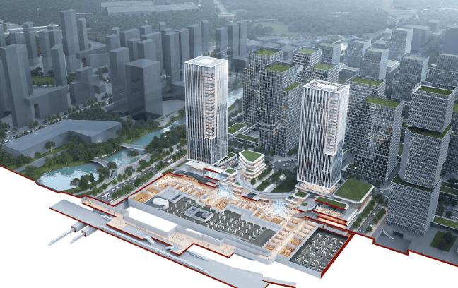 建筑设计强调以交通为导向的开发模式,梳理并优化了地下空间与轨道站点的换乘流线,通过南北向中轴主动线引导人流。北地块规划的双子塔楼形成沿文化水轴的门户形象,南地块的200米地标塔楼则与西侧用地共同构成区域性地标集群。人才公寓与塔楼错位布置,以最大化景观视野。