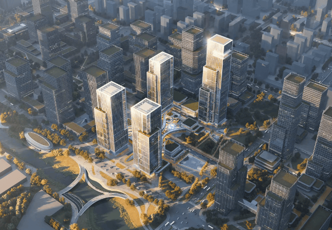 项目位于钱江世纪城城北组团,紧邻中央水轴与钱塘江,坐拥双地铁枢纽。此次国际征集竞赛聚焦约3.7公顷的核心地块,最终由Farrells的建筑设计方案胜出。方案围绕“两带一芯”的空间格局展开,注重建筑体量与城市肌理的融合,通过错落布局的塔楼与多尺度公共空间,塑造出富有层次的城市界面与生态有序的天际线。