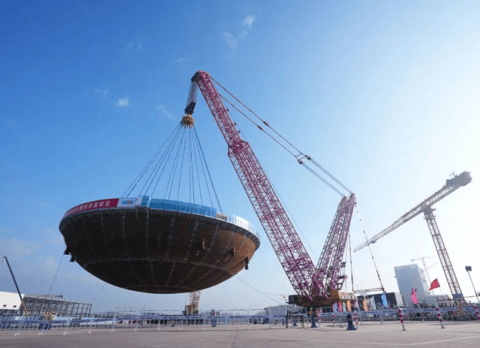 钢制安全壳由底封头、圆柱形筒体(一至三环)和顶封头五大模块组成,是核岛反应堆厂房的第三道安全屏障。本次吊装的底封头是钢制安全壳的基底,采用半椭球形结构设计,由64块高强度低合金钢板组焊而成。