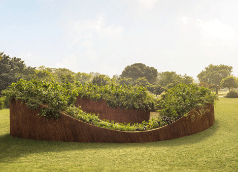 螺旋结构由升级改造的马缨丹(Lantana camara)建造而成,这是一种通过18世纪殖民贸易路线引入印度的入侵灌木。如今,马缨丹覆盖超过1300万公顷土地,威胁大片森林,而在此它被重塑为结构网格,由Ekarth Studio制作。其上方,由超过四十种本土植物物种组成的活体冠层,包括可食用、药用及具有文化意义的品种,形成了一个功能性微生境。